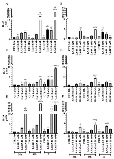 Interestingly and different from those observed with LA and GA treatments alone, when oAECs were treated with the mixture LA:GA, their viability was strongly negatively affected starting from LA:GA 20 mM. Indeed, non-buffered acidic media at 20 and 40 mM concentrations resulted lethal for all the time points (Figure 9C,F,I). A significant viability decrease was also observed in general between 5 mM and the other concentrations (p < 0.001; Figure 9C,F,I), depending on the time culture and more markedly compared to single acid treatments (Figure 9C,F,I). Also in this treatment, when buffered LA:GA media were used, vitality increased in particular at 20 and 40 mM LA:GA (p < 0.05) compared to non-buffered media at the same concentrations (Figure 9C,F,I).