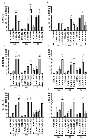 The reverse transcriptase quantitative real-time polymerase chain reaction (RT-qPCR) method was used to compare immunomodulatory related genes in CTR and oAEC treated with non-buffered or buffered PLGA degradation by-products at different concentrations (5, 10, and 20 mM) for 24 h, 48 h, or 7 d. Total RNA was extracted using TRIzol (Sigma-Aldrich, St. Louis, MO, USA), according to previously published reports [,]. One µg of total RNA from each sample was utilized for cDNA synthesis using an RT reaction with Random Hexamer Primers and Tetro Reverse Transcriptase (Bioline, Germany) in a final volume of 20 µL. SensiFASTTM SYBR Lo-ROX Kit (Bioline) was used to perform real-time qPCR analysis employing genes’ primer sequences for pro-inflammatory interleukin 12b (IL-12b) and anti-inflammatory interleukin 10 (IL-10) associated genes, according to the manufacturer’s instructions. The reaction was carried out with 7500 Fast Real-Time PCR System (Life Technologies, Waltham, MA, USA) using a two-step cycling protocol for 40 cycles (10 s at 95 °C for denaturation and 30 s at 60 °C for annealing/extension), followed by melt-profile analysis (7500 Software version 2.3). Each sample was run in triplicate for each gene expression, and the results were standardized to the endogenous GAPDH reference gene. The relative gene expression ratio (2−∆∆Ct) was computed using the comparative Ct (∆∆Ct) method.