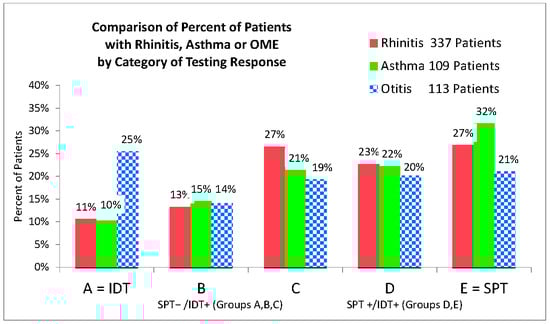 Comparison of Relative Frequency of Patients with Allergic Rhinitis, Asthma or OME by IDT Sensitivity.