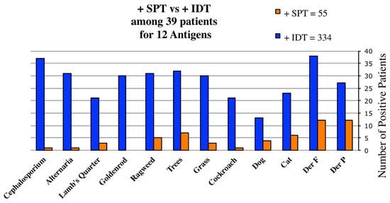 The results of testing the same twelve antigens by SPT and IDT among these 39 patients are graphically compared in Figure 2. Both IDT and SPT were positive in 19.6% and negative in 22% of tests. However, IDT found 3.7-fold more reactive allergens per patient than SPT (8.56 vs. 2.3) (Chi Square p < 0.01). SPT testing of these 39 patients for 12 antigens found 55 antigens positive and 413 negative.