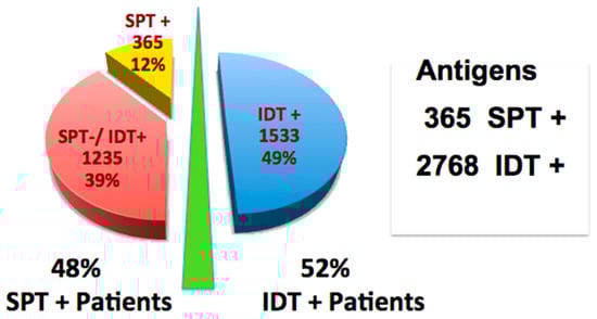 After six months of AIT, 94.3% of patients reported an average symptom improvement of 64%. IDT detected 3.7-fold more allergens per patient than SPT (8.56 vs. 2.3, p < 0.01). The implied false-positive skin test rate, suggested by treatment failure, was low, and statistically there was no difference by Chi Square test for SPT−/IDT+ failures (5.7%) as compared to SPT+/IDT+ failures (5.1%) (p > 0.05).