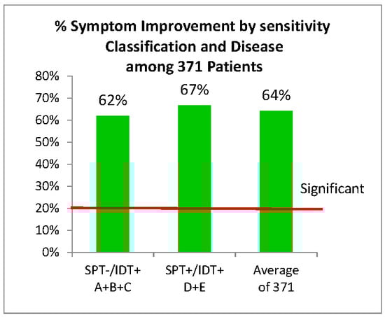 The magnitude of improvement in the high- and low-sensitivity groups was compared. There is no significant difference between the 67% improvement among the most sensitive SPT+/IDT+ patients (groups D and E) and the observed 62% for the least sensitive SPT−/IDT+ patients (groups A, B and C) (Chi Sq. 0.03, p = 0.86; 95% Cl 0.048, 0.040) (Figure 4).