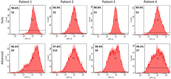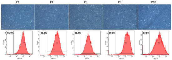 In early subcultures (S2 and S3), a highly homogenous endothelial cell population was observed, as shown by the percentage of 98.7 ± 1.1% of CD31-positive cells detected by flow cytometry (Figure 4). Interestingly, in advanced subcultures (S8–S10), the percentage of CD31-positive cells remained unchanged 98.4 ± 0.6%: p = 0.404), despite the enlargement of the histogram width (Figure 4).