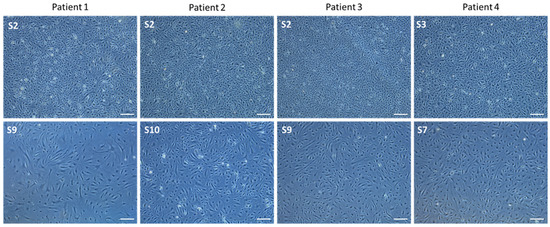 In early subcultures (S2 and S3), a typical cobblestoned morphology of PAECs isolated from four different patients was observed. In advanced subcultures (S7–S10), elongated myofibroblast-like and hypertrophic cells occurred (Figure 3).
