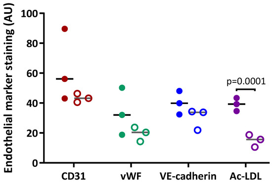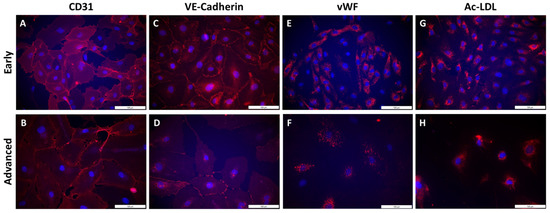Cell hypertrophy was observed (Figure 5B,D), with a significant increase in cell surface area in advanced compared to early subcultures (Figure 7B). Intracellular expression of the specific endothelial marker vWF (Figure 5E) and the uptake of Ac-LDL by endothelial-specific scavenger receptors (Figure 5G) were profuse in early subcultures and seemed to be reduced in advanced subcultures (Figure 5F,H), with a significant decrease in Ac-LDL uptake in advanced compared to early subcultures (Figure 6).
