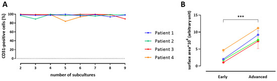 CD31-positive cells isolated from 4 individual patients throughout subcultures (A). Quantitative analysis of endothelial cell hypertrophy from 4 individual patients at early and advanced subcultures (B). Paired t-test, *** p = 0.0001.