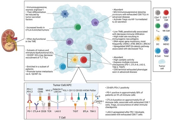 High TMB is a common feature shared among the majority of tumor types known to respond to ICIs [68,69,70,71]. RCC is unique in that despite its high degree of immune infiltration, these tumors have proven to contain a relatively low mutational burden. RCC has a mutation rate of approximately 1.1 mutations/megabase (mut/Mb), even lower (<1 mut/Mb) in chRCC [72,73]. That places RCC lower than many of its ICI-approved counterparts, including melanoma, non-small-cell lung cancer, urothelial carcinoma, colorectal cancer, cervical cancer, head and neck cancer, endometrial cancer, and hepatocellular carcinoma. ccRCC demonstrates a paradoxical correlation in which higher TMB is associated with decreased survival and decreased levels of intra-tumoral CD8 T cells, M1 and M2 macrophages, CD4 memory resting T cells, and DCs [74]. Separate database analysis correlated high TMB in ccRCC with lower gene expression for TILs, immune checkpoints, cytokines, and other pro-inflammatory genes, and high TMB in pRCC was associated with low PD-L1 levels, Tregs, and expression of pro-inflammatory genes [75].