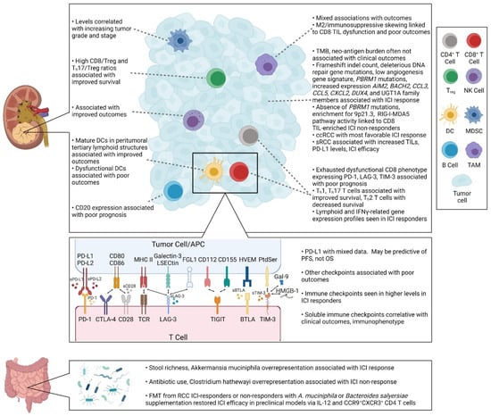 Among the other immune cell types, NK cells, CD11c+ TAMs, and mature DCs have been associated with improved outcomes [37,56,74,121,132], and CD206+ TAMs, CD20+ B cells, and DC-LAMP+ and dysfunctional DCs with decreased prognosis [45,56,121,127,132]. Immunosuppressive M2-phenotype macrophages in advanced disease may exist in a immune dysfunction circuit with terminally exhausted CD8 TILs, which together was linked to poor outcomes [41]. In an analysis of 14 cancer types, poor survival with high B cell infiltration was specifically associated with high expression of MS4A1 (CD20) for ccRCC [45]. With respect to DCs, mature functional DCs that aggregate in peritumoral tertiary lymphoid structures have been associated with better prognosis [121], in contrast to poorer outcomes seen tumors with dysfunctional DCs [127]. Further, utilizing patient-derived xenograft models, an inflamed TME RCC subtype, with enrichment for the stromal compartment and multiple immune-infiltrating cell types (CD8 T cells, Th1 T cells, Tregs, NK cells, neutrophils, and TAMs), was associated with decreased survival [133].