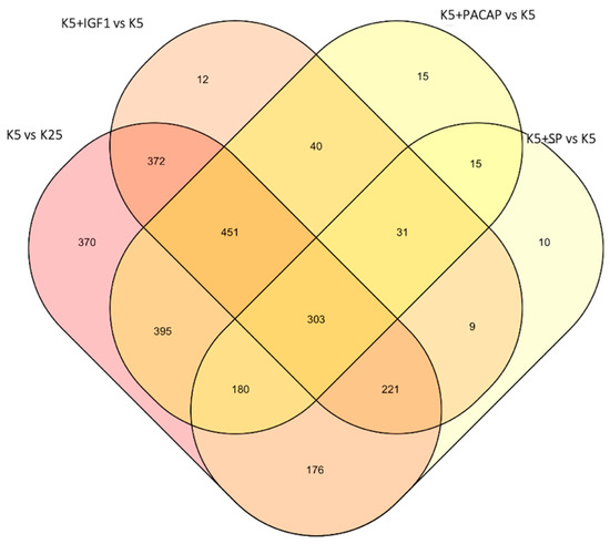 Venn diagram showing the number of genes differentially expressed in CGNs over time following induction of apoptosis (K5 vs. K25) or following rescue by SP, Pacap and Igf1. Of note, 262 genes (303 probes) were differentially expressed in all experimental conditions.