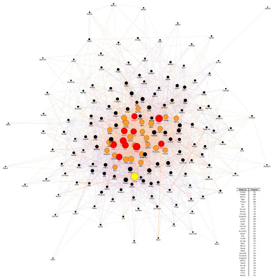 PPI network analysis. The PPI network for the 175 core set genes containing 187 nodes and 2668 interactions was constructed using the STRING website and visualized by Cytoscape (version: 3.8.2,) by mapping the “degree parameter” to node size. As the node size increased, the value of the connectivity degree of node genes increased. Proteins with a degree connectivity of >50 represent the most significant nodes in the PPI network and are colored from orange to red based on their node degree. Cebpb is the most interconnected node (hub) in the network and is colored in yellow. Differently colored “edges” indicate the type of evidence supporting each interaction: dark purple, co-expression; light purple, physical interaction; light blue, co-localization; light green, shared protein domain; orange, predicted; grey, other.