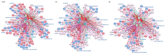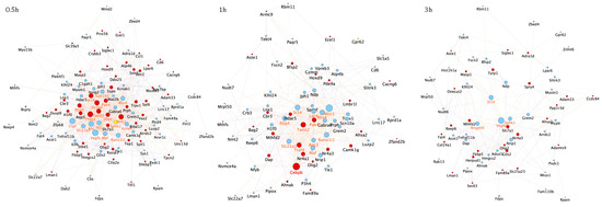 Temporal specific core set genes-related PPI networks. The three time-point (0.5, 1 and 3 h) specific core set genes-related PPI networks were constructed using the STRING website and visualized by Cytoscape (version: 3.8.2,) by mapping the “degree parameter” to node size. As the node size increased, the value of the connectivity degree of node genes increased. Light blue/red nodes indicate, respectively, down-/upregulated genes following treatment with all GFs compared with apoptotic CGNs (K5). Differently colored “edges” indicate the type of evidence supporting each interaction: dark purple, co-expression; light purple, physical interaction; light blue, co-localization; light green, shared protein domain; orange, predicted; grey, other.