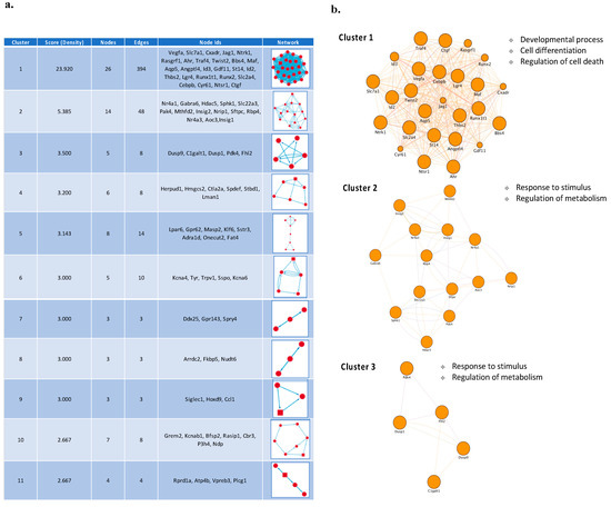 PPI network cluster analysis. (a) Sub-network analysis in the PPI network using MCODE identified 11 significant modules/clusters Cluster analysis in the PPI network resulted in 7 clusters, which include 72 nodes and 276 edges, and are enriched for several biological process GO terms. (b) Cluster 1, Cluster 2 and Cluster 3 of the top three network clusters in the sub-network analysis of PPI networks of core set genes. These clusters had the highest scores among the clusters. The cluster networks were visualized by Cytoscape by mapping the “degree parameter” to node size.