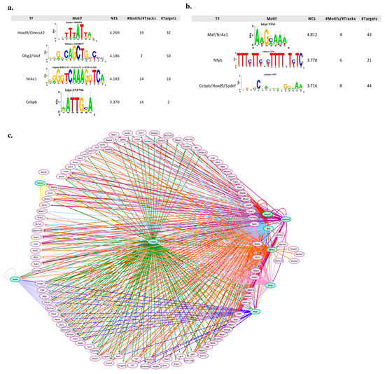 To identify candidate upstream regulators potentially involved in the time-dependent transcriptional regulation of neuronal apoptosis and survival, we performed an in silico analysis to predict transcription factors (TFs) whose binding sites are enriched in the promoter regions of core set genes using the iRegulon software. Our analysis yielded 118 significantly enriched motifs (66 for upregulated and 52 for downregulated genes) that clustered into 14 groups by similarity, with more than 100 transcription factors predicted to potentially bind the motifs present in the core set genes (Tables S7 and S8). We then filtered the list of enriched TFs, by including only those present in the core set gene. This led to the identification of the following nine transcription factors: Homeobox D9 (Hoxd9), Musculoaponeurotic fibrosarcoma (Maf), Nuclear receptor 4A1 (Nr4a1), CCAAT Enhancer Binding Protein Beta (Cebpb), Oligodendrocyte transcription factor2 (Olig2), One Cut Homeobox 2 (Onecut2), SAM Pointed Domain Containing ETS Transcription Factor (Spdef), Twist Family BHLH Transcription Factor 2 (Twist2) and Nuclear Transcription Factor Y Subunit Beta (Nfyb) (Figure 6). These nine transcription factors are predicted to directly regulate 66% (115/175) of the core set genes, with the majority of these predicted to be co-regulated by two or more of the transcription factors (Figure 6). In particular, the transcription factor Hoxd9 potentially targets the vast majority of the core set genes (degree = 142), as identified in the regulatory network analysis, and also represents the TF with the highest NES score for up-regulated genes (NES score = 4.269) (Figure 6a–c). On the other hand, the TF with the highest NES score for downregulated genes is Nr4a1 (NES score = 4.812) (Figure 6b). In addition, the “regulator-target genes analysis” identified Hoxd9, Maf, Nr4a1 and Cebpb as the most significantly overrepresented TFs in the promoters of both upregulated and downregulated core set genes (Figure 6a,b). Olig2 and Onecut2 were selectively enriched for upregulated core set genes, whereas Twist2, Nfyb and Spdef were predicted to potentially bind the motifs present only in downregulated core set genes (Figure 6a,b).