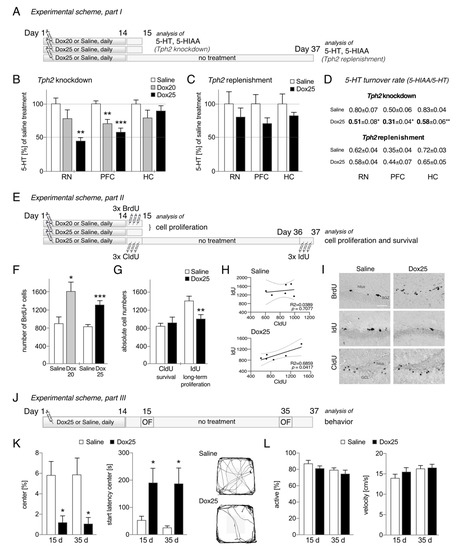 Effects of conditional brain serotonin knockdown, followed by recovery. (A) Experimental design part I: Tph2 knockdown and Tph2 replenishment to manipulate serotonin (5-HT) levels. TetO-shTPH2 transgenic rats received daily treatment of either saline, Dox20, or Dox25 for 14 days to determine 5-HT concentrations and its metabolite, 5-HIAA, in brain tissue on day 15 following Tph2 knockdown. Another group of TetO-shTPH2 rats receiving either saline or Dox25 was held for an additional 3 weeks (no treatment, Tph2 replenishment) to analyze 5-HT and 5-HIAA levels at day 37. (B) Fourteen days of continued i.p. Dox administration into TetO-shTPH2 rats significantly decreased 5-HT levels in RN (upon Dox25) and PFC (upon Dox20 and Dox25) with no changes observed in the HC. Dunnett’s post hoc tests ** p < 0.01, *** p < 0.001. (C) Following 3 weeks without treatment (Tph2 replenishment), 5-HT levels had recovered in the RN and PFC; no differences between treatment groups were observed. (D) A significant decrease in the rate of 5-HT usage in RN, PFC, and HC was determined following Tph2 knockdown while the differences were obsolete following Tph2 replenishment; Student’s t test * p < 0.05, ** p < 0.01; RN, raphe nuclei, PFC, prefrontal cortex, HC, hippocampus. (E) Experimental design part II: Cell proliferation and survival in the dentate gyrus. At 14 days following treatment with saline, Dox20, or Dox25, a first group of TetO-shTPH2 rats received three injections of BrdU and were killed the following day to analyze cell proliferation. A second group (saline- and Dox25-treated) received two other halogenated thymidine markers for long-term analysis: CldU was injected three times on day 14 and cell survival was analyzed at day 37; IdU was injected on day 36 and rats were killed the next day. (F) Fourteen days of continued i.p. administration of Dox significantly increased the number of BrdU-positive cells in the dentate gyrus of Dox20 and Dox25 groups compared with saline. Student’s t tests * p < 0.05, *** p < 0.001. (G) No difference in cell survival (CldU) was observed compared between treatment groups; while Tph2 replenishment affects long-term cell proliferation: the number of IdU-positive cells was significantly decreased, Student’s t tests ** p < 0.01 to IdU saline control. (H) A positive correlation of CldU/IdU labeling was observed for the Dox25 group but was absent in saline control. (I) Peroxidase staining to characterize BrdU-, IdU- and CldU-labeled cells in hippocampus. BrdU and IdU injections 1 day prior to tissue collection shows the characteristic clustered distribution of proliferating cells within the SGZ that is in opposite between treatment groups, BrdU vs. IdU; CldU injected 3 weeks prior to tissue collection permits assessment of survival and reveals migration of labeled cells into the GCL. Scale bar 100 µm. BrdU, bromodeoxyuridine, CldU, 5-chloro-2′deoxyuridine, GCL, granule cell layer, IdU, 5-iodo-2′deoxyuridine, SGZ, subgranular zone. (J) Experimental design part III: Behavior response to Tph2 knockdown vs. Tph2 replenishment. Animals of the long-term group were subjected to an Open Field arena on days 15 and 35. (K) Dox25-treated TetO-shTPH2 rats spent significantly less time in the center of the arena (in percentage) that is accompanied by increased start latency to enter (in time) at both time points, days 15 and 35, compared with saline control, Tukey’s post hoc test * p < 0.05; center vs. periphery is 50%. (L) Locomotor behavior was intact; no differences were observed in activity levels (in percentage), and mean velocity (cm/s).