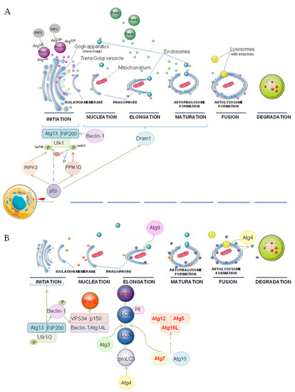 The possible molecular mechanism of genotoxic-induced alternative (A) and canonical (B) autophagy indicating proteins and organelles involved in these processes. P—phosphorylation, PE—phosphatidylethanolamine. The main figure conception was partially adapted from [47,52]. Graphical elements were adapted from Servier Medical Art (smart.servier.com accessed on 11 November 2021).