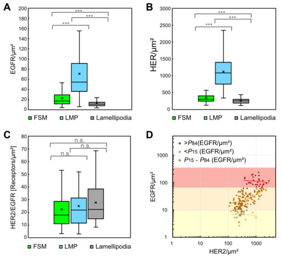 Distributions of local EGFR and HER2 ρR, and HER2/EGFR ratios in three different plasma membrane regions. (A) Box plots of EGFR ρR determined from data of STEM images from FSM regions (number of analyzed images n = 102), LMP (n = 64), and lamellipodia (n = 31). Differences between the regions were statistically significant. (B) Box plots for HER2 ρR for the same regions as in (A), revealing similar statistic differences between the membrane regions as found for EGFR. (C) Box plot of the HER2/EGFR ρR ratios in the three plasma membrane regions. The ratios were not statistically different between the three regions. (D) Dot plot of corresponding EGFR and HER2 ρR in all acquired STEM images analyzed to test a correlation between EGFR and HER2 ρR. The data set was divided into three groups, depending on the EGFR ρR. Linear regression (lines) of the subgroup representing an intermediate level of EGFR ρR (P15–P84, orange dots) yielded a Pearson correlation coefficient R2 = 0.4, thus indicating a weak correlation. However, the data of the upper 15% (>P84, red dots) and the lower 15% (<P15, yellow dots) of EGFR ρR yielded R2 < 0.02, respectively R2 < 0.01, thus lacked any correlation. p values: *** < 0.001.