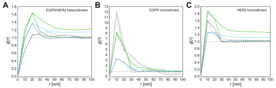 Since labels may also have been positioned at close proximity due to random chance, a statistical analysis was needed to test for the presence of receptor dimers. QD-label pairs can be identified as belonging to dimers [17,48] through statistical analysis of the label pair distance r via the pair correlation function g(r) [43]. This function measures the probability of finding a range of r values in the data. The function is normalized such that g(r) = 1 for a random particle distribution and g(r) > 1 reflecting clustering, for example, dimerization [17,50]. The g(r) of QD-labeled EGFR or HER2 had a typical peak with a maximum at r = 10–20 nm, depending on the size of the QD used (Figure 6), consistent with the label center-to-center distance for labeled receptor dimers (Figure 1). The peak extended up to 30 nm. Such peak would not be present for randomly distributed receptors, since pre-clustering was ruled out in previously published control experiments [17,44], the peak thus indicates the presence of homodimers. For analyzing heterodimers, we used an extended bivariate pair correlation function between pairs of different labels g2(r).