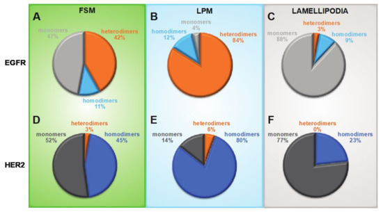 EGFR and HER2 distribution profiles of heterodimers, homodimers, and monomers in three characteristic membrane regions. (A–C) Pie charts showing the determined fractions of monomeric, hetero- and homodimeric fractions of EGFR. (D–F) Pie charts for the correspondingly determined fractions of HER2 in heterodimers, homodimers and monomers.