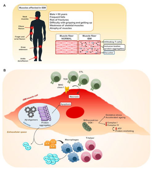 Originally defined as a degenerative pathology, inclusion body myositis, like Alzheimer’s disease, has recently been reclassified as an inflammatory pathology with degenerative sequalae [1,2]. Muscle biopsies have indicated the presence of invading CD8+ cytotoxic T lymphocytes (CTL) and macrophages, with CD4+ T lymphocytes and macrophages localized to the non-necrotic muscle tissue. The presence of autoantibody to cytosolic 5′-nucleotidase 1A (5NT1A), an enzyme involved in the regulation of adenosine levels that is highly expressed in skeletal muscle, also indicates an involvement of the humoral branch of the immune system, whereby the 5NT1A-specific antibodies produced by autoreactive B lymphocytes can contribute to the immune/inflammatory destruction of the muscle tissue. In addition, an up-regulation of the major histocompatibility complex (MHC)-I molecule is observed in affected muscle tissue fibers, likely directing the CTL-mediated response in these tissues. Rimmed vacuoles with inclusions are also a characteristic feature of IBM, although they are absent in about 20% of IBM patients, nor will all the affected muscle fibers from patients with inclusions stain for these structures [1,2]. These inclusions have been proposed to be due to an alteration in protein synthesis and processing that results in the accumulation of toxic beta-amyloid (Abeta) and TAU complexes, although more than 80 proteins (including ubiquitin, HSP70, γ-tubulin, BACE 1/2, nNOS, iNOS, SOD1, IL1α/β, IL6 and GSK3, among others) have been identified and Abeta and TAU are not always present [2,3,4]. Not only do these complexes induce apoptotic pathways, but they have also been shown to stimulate the release of interleukin (IL)-6, an inflammatory cytokine that promotes the recruitment/activation of inflammatory macrophages and natural killer (NK) cells as part of the innate immune response, and in CD4+ T-helper and B-cell differentiation during adaptive immune responses [1,2]. In addition, muscle biopsies from IBM patients demonstrate an increased number of cytochrome c oxidase negative fibers, indicating alterations in mitochondrial homeostasis and cellular respiration. To this end, a study by Hedberg-Oldfors et al. has recently reported that IBM muscle tissue contains mitochondrial DNA (mtDNA) rearrangements (deletions and duplications) and nucleotide variants, with the average mtDNA copy number in IBM muscle reduced by 42% [5]. This was found to result in significant complex I and complex IV deficiency in COX-deficient fibers. Such mitochondrial defects produce pleotropic effects including reduced ATP generation, enhanced ROS production and the misfolding of proteins (Figure 1).