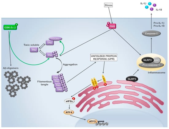 The microtubule-associated protein TAU, the product of the mapt gene, serves the purpose of facilitating microtubule assembly, thereby linking the cytoskeletal microtubule components to the plasma membrane. At least nine different isoforms of TAU are produced through alternative splicing, with some isoforms restricted to a specific developmental stage and/or tissue [68]. The largest isoform, PNS-TAU, is expressed in the peripheral nervous system, whereas the other isoforms are found in the central nervous system, kidney and urinary tract tissues, female tissues, muscle and adipose/soft tissues. TAU is a highly modified protein that is a target of at least twelve different kinases, including GSK3α/β [68,69,70,71,72]. The analysis of the PhosphoSitePlus database indicates that while GSK3α has been shown to phosphorylate a number of TAU isoforms (isoforms 2, 5, 6 and 8), GSK3β has been demonstrated to phosphorylate isoform 8 (Table 3) [62,73,74,75,76,77,78,79,80,81,82,83,84,85,86,87]. The majority of the sites phosphorylated by the GSK3 kinases lie near to or within the C-ter tubulin binding repeat (aa 560–690), with the exception of two sites phosphorylated by GSK3β (S46 and T50). In general, the phosphorylation of these residues results in the detachment of TAU from the microtubule complex and disassembly. In normal tissue development, the assembly–disassembly process is regulated through an interplay between the O-GlcNacylation, phosphorylation and dephosphorylation of these sites. As phosphorylation and O-GlcNacylation are mutually exclusive post-translational modifications on a specific site, the interplay between these modifications either leads to O-GlcNacylation with consequential microtubule assembly or phosphorylation resulting in microtubule disassembly. In multiple degenerative diseases such as AD and IBM, the loss of O-GlcNacylation has been associated with the hyperphosphorylation of TAU [68,69]. These hyperphosphorylated TAU molecules become seeds for the development of filamentous tangles which lead to the activation of the unfolded protein response (UPR), through the stress activation of the PKR-like endoplasmic reticulum kinase, PERK, and the NLRP3 inflammasome, through the activation of the stress/inflammatory kinase PKR, resulting in enhanced IL-1β synthesis, progressive inflammation, cell death and disease (Figure 2) [88,89,90,91,92,93,94].