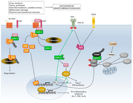 - Khan, K.A.; Do, F.; Marineau, A.; Doyon, P.; Clement, J.F.; Woodgett, J.R.; Doble, B.W.; Servant, M.J. Fine-Tuning of the RIG-I-Like Receptor/Interferon Regulatory Factor 3-Dependent Antiviral Innate Immune Response by the Glycogen Synthase Kinase 3/beta-Catenin Pathway. Mol. Cell. Biol. 2015, 35, 3029–3043. [Google Scholar] [CrossRef]