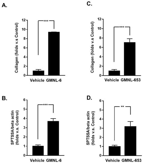 Both collagen and ceramide play a critical role during skin repair or connective tissue remodeling after injury [25]. Serine palmitoyltransferase activity is the rate-limiting step in ceramide biosynthesis [25,26]. Thus, we first evaluated the skin beneficial potential of heat-killed probiotics preparations of GMNL-6 or GMNL-653, by the determination of collagen protein synthesis, and the mRNA expression of serine palmitoyltransferase small subunit A (SPTSSA) in human foreskin fibroblasts, Hs68 cells. The results revealed that the collagen synthesis ability increased significantly after treatment of heat-killed GMNL-6 (Figure 1A, approximately 9-fold) or GMNL-653 (Figure 1B, approximately 7-fold). Similarly, the heat-killed GMNL-6 or GMNL-653 could also upregulate the gene expression of SPTSSA compared with vehicle treatment (Figure 1C for GMNL-6 and Figure 1D for GMNL-653). These data suggest that these two heat-killed probiotic preparations of GMNL-6 or GMNL-653 might have beneficial effects on skin repair.