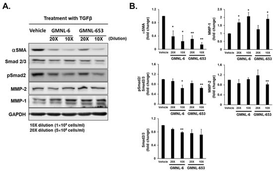 The heat-killed probiotics GMNL-6 or GMNL-653 preparation inhibits the TGF-β induced phosphorylation of Smad2 but increases the expression of MMP1 in Hs68 cells. Hs68 fibroblast cells were seeded onto 6-well-plates at a density of 2 × 105 cells/well and treated with 20 ng/mL TGF-β in combination with the heat-killed GMNL-6 or GMNL-653 preparations at 10 fold (10×, 1 × 109 cells/mL) or 20 fold (20×, 5 × 108 cells/mL) dilution for 48 h. The proteins expressions of α-smooth muscle actin (αSMA), phosphorylated Smad2, total Smad2/3, MMP-1, or MMP-2 were determined by western blot analysis (A) and the bar graphs presented in (B) were resulted from two independent experiments. * p < 0.05; ** p < 0.01.