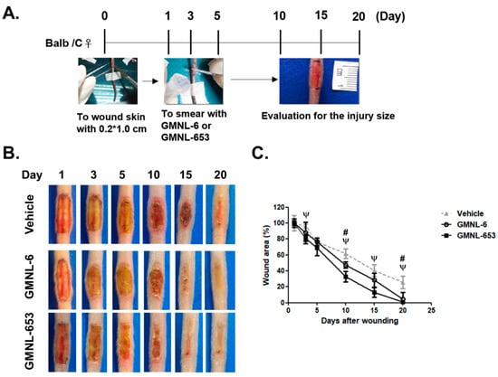 Heat-killed probiotics preparations of GMNL-6 or GMNL-653 exhibit excellent wound healing ability in mice. (A) The experimental scheme experimental skin wound of mice tails and treatment protocol using smeared gels with heat-killed GMNL-6 or GMNL-653 preparation. (B) The selected images of tail wounds were taken at the indicated day after wound introduction. Other images of each mouse used in this experiment were presented in Figure S1. (C) The quantified results of the tail wound images. For each group, n = 4; values present mean ± SEM; # or ψ presented as the p < 0.05 of GMNL-6 group or GMNL-653 group compared to the vehicle treatment group, respectively.