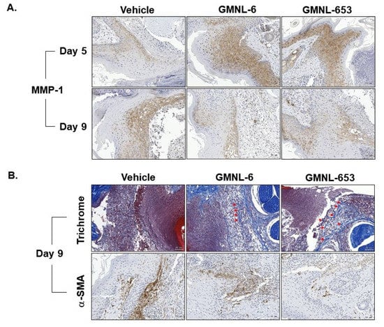 The treatment of heat-killed Lactobacillus GMNL-6 or GMNL-653 increases MMP-1 expression in the early stage and decreases αSMA expression at the later stage during the tail-wound healing. The experimental tail wounds were introduced as described in the Materials and Methods section and covered with gels that contained heat-killed GMNL-6 or GMNL-653 bacterial cells. The expressions of MMP-1 (A) or αSMA (lower panel in B) were determined by immunohistochemistry and the collagen fibers were determined by Trichrome stain (upper panel in B). Arrows in the upper panel of (B) indicated the structured collagen fibers.