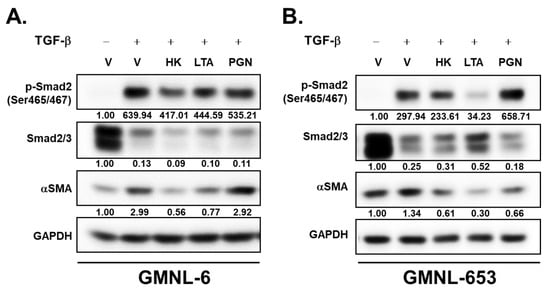 The treatment of lipoteichoic acid (LTA) caused similar benefits to those of heat-killed GMNL-6/GMNL-653 in TGF-β-induced fibrosis of Hs68 cells. The Hs68 cells were treated with 20 ng/mL TGF-β alone or in a combination of heat-killed (HK) Lactobacillus bacteria suspension at 1 × 109 cells/mL, or the derived LTA at 50 μg/mL or peptidoglycan (PGN) at 50 μg/mL for 24 h followed by harvesting the total cellular proteins. The expressions of Smad2 phosphorylation and αSMA were determined by western blot. (A) GMNL-6, (B) GMNL-653. The inserted numbers indicated relative expression level in comparison to the vehicle (V) and without TGF-β treatment.