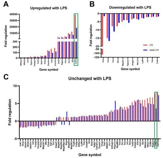 A TLR signalling gene array identified the Csf2 gene as markedly affected by Gas6/TAM signalling in microglial cells undergoing inflammatory stimulation. An RT2 Profiler Gene Array for the TLR signalling pathway was used to measure the expression of 84 genes of interest in pure mouse microglial cultures. Microglia were treated with LPS (10 ng/mL; blue bars) for 8 h in the presence or absence of Gas6 co-incubation (1.6 μg/mL; red bars) added 1 h before and present thereafter. Results are presented as: (A) genes upregulated more than 10-fold after LPS stimulation, (B) genes downregulated more than 2-fold with LPS or (C) genes that were mostly unchanged with LPS treatment. Data is displayed as fold regulation (the negative inverse of fold change for values less than one) of gene expression and is from an exploratory experiment in one mouse culture. Green boxes highlight the genes for which Gas6 presence markedly altered the LPS-induced expression changes.