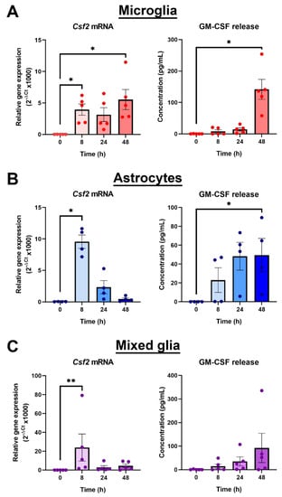 Microglia are the main resident CNS glial source of GM-CSF. Time course of GM-CSF upregulation by LPS (10 ng/mL) in: (A) pure microglial cultures, (B) pure astrocyte cultures and (C) mixed glial cultures, using RT-qPCR and ELISA to measure gene expression and protein release into the cell media, respectively. Gene expression is displayed as relative gene expression (2−ΔCt) and protein concentration is in pg/mL. Statistical analysis was determined using Friedman’s tests with p < 0.05 (n = 4–5 independent experiments on separate cultures). * p < 0.05, ** p < 0.01.