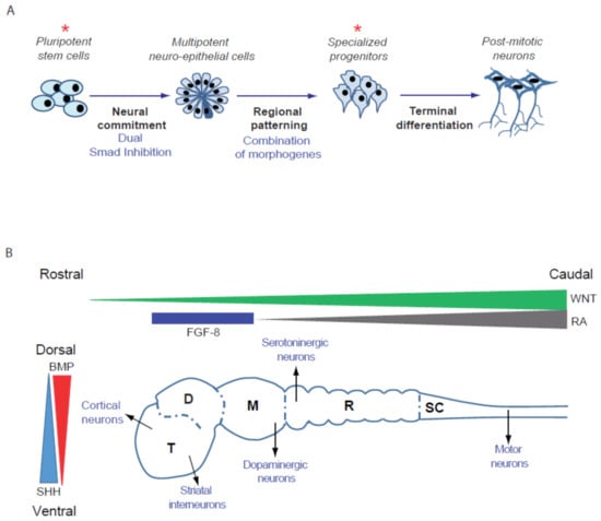 Specification of different types of neurons starting from pluripotent stem cells. (A) Steps leading from PSCs to terminally differentiated neurons. Stars indicate the self-renewing cell types that can be amplified and frozen to create large cryopreserved banks of biological materials. (B) Schematic representation of the human fetal brain with the 5 different regions, example of the type of neurons that emerge from these regions and the main morphogens involved in patterning. T, telencephalon; D, diencephalon; M, midbrain; R, rhombencephalon; SC, spinal cord; BMP, Bone Morphogenetic Factor; FGF-8, Fibroblast Growth Factor-8; RA, retinoic acid; SHH, Sonic Hedgehog.
