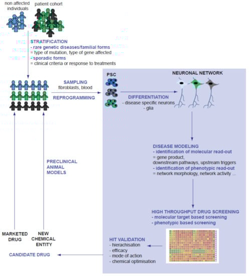 In summary, compared to other models previously used for neurological disorder-related drug discovery, PSC-derived models combine the relevancy of human primary neural cells and the flexibility of a cell line. Progenitors can be expended until reaching the cellular mass necessary to perform target identification and to conduct high-throughput screening of compounds. Once differentiated, patient-derived cells possess the molecular, electrophysiological and morphological particularities of post-mitotic neurons of the patient, offering the possibility to study the influence of their genetic background on the expression of the disease and the differential response to drugs. In the last decade, PSC-neural cells derived from patients affected by rare genetic diseases have paved the way for disease modelling and drug discovery, mainly by examining the repositioning of existing therapeutic compounds. Collections of iPSCs reprogrammed from individuals with more frequent disorders are now available and offer an unpreceded substrate to better understand more complex diseases, stratify patients, develop new early pharmacological interventions and adopt precision medicine approaches (Figure 2).