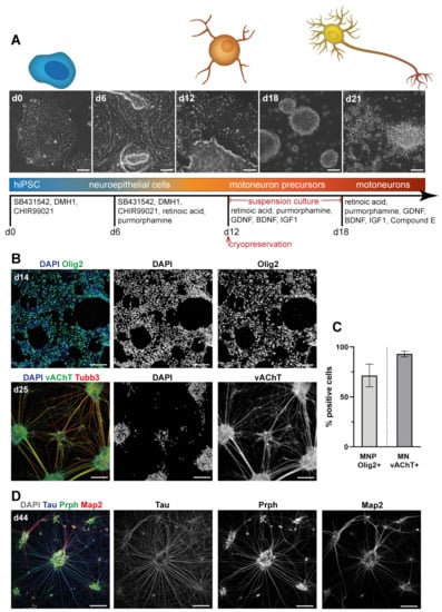 For differentiation of MN from hiPSC, a small molecule differentiation protocol described by Du and colleagues [26,35] was employed with slight modifications (see Methods section). Images of differentiation stages and the sequence of molecular factors are shown in Figure 2A. Briefly, hiPSC were induced to neuroepithelium for six days by dual SMAD inhibition and WNT activation followed by caudal and ventral patterning with retinoic acid and the Sonic hedgehog activator purmorphamine. After 12 days, MN precursors positive for Olig2 (71.5 ± 11.4% of total cells, mean ± SD) were obtained (Figure 2B,C). These could be expanded and cryopreserved. From day 12 on, precursors were cultured in suspension with added neurotrophic factors for six days and then seeded adherently again for final maturation. MN obtained after 20–30 days of differentiation were positive for vesicular acetylcholine transporter (vAChT; 93.0 ± 2.9% of total cells), as shown in Figure 2B,C. MN could be cultured and further matured up to day 50 and were furthermore confirmed by immunostaining to express βIII-tubulin (Tubb3), Hb9, Isl1, choline acetyltransferase (ChAT), Map2, tau, peripherin (Prph), and synaptophysin (Sph); representative images are shown in Figure 2D and Supplementary Figure S1.