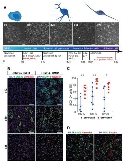 To achieve this, we present an improved differentiation protocol to derive human SC from hiPSC with increased robustness. When employing a SC differentiation protocol which does not necessitate purification steps [24], a secondary cell population positive for SOX2 but negative for SOX10 was frequently observed, suggesting insufficient neural crest induction. This was in accordance with literature, where oftentimes low cell yields are reported in differentiation protocols for obtaining neural crest in general and, specifically, SC [21,36]. A possible reason could be insufficient activation of BMP signaling, which is required for neural crest specification [56]. However, deliberate BMP activation by small molecules can also antagonize neural crest specification [57], and timing regarding the differentiation process is crucial [58]. The work of Hackland et al. proved that precise activation of BMP signaling to an intermediate level is necessary for the development of neural crest cells and demonstrated the presence of different levels of endogenous BMP between different PSC lines and experiments. Their findings explain previous conflicting results regarding either promotion or inhibition of neural crest specification upon BMP activation in cell culture and could also be a reason for low cell yields or varying differentiation success between distinct PSC lines and differentiation batches in SC differentiation protocols. In such protocols, which do not add compounds to interfere with BMP signaling, differentiation efficiency would possibly depend on inherent BMP signaling levels in PSC lines and culture systems used. Consequently, we explored a top-down inhibition system as suggested by Hackland et al., i.e., saturating with BMP4 exogenously while using the BMP antagonist DMH1 to attenuate signaling to a precise level. In accordance with their results, efficient and robust derivation of SOX10+ neural crest cells could be achieved, and these cells were found to be competent to further differentiate along the SC lineage.