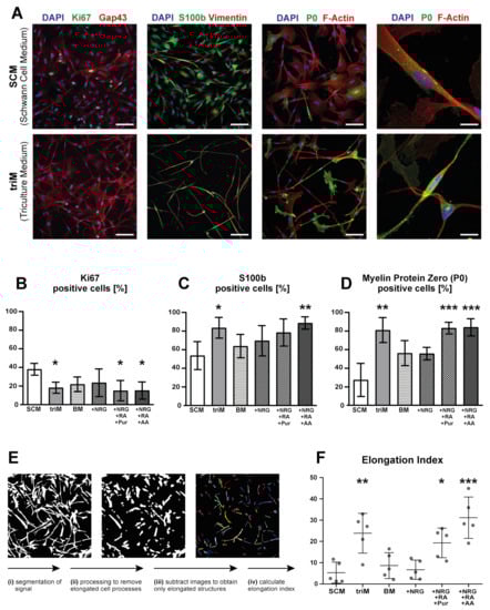 Triculture medium promotes differentiation of hiPSC-derived Schwann cells. SC differentiated from hiPSC using the SC differentiation protocol, including BMP4 tuning, were cultured for three days in either standard SC medium (SCM), fully supplemented triM, triculture basal medium (BM), or BM with supplementation of different factors (indicated by “+”). Then, cells were fixed and stained for different marker proteins and imaged using fluorescence microscopy. (A) Representative micrographs of cells stained for Ki67, Gap43, S100b, Vimentin, P0, and F-actin (color codes indicated on top of each panel); examples shown for SCM and triM conditions. Scale bars: 100 µm; zoom images in fourth column: 20 µm. (B–D) Quantification of cells positive for Ki67 (B), S100b (C), and P0 (D) for all conditions. Mean ± SD (n = 5 for Ki67 and S100b, n = 3 for P0). (E) Illustration of image processing workflow to calculate the elongation index. (F) Comparison of elongation index values obtained for all conditions. All values presented as mean ± SD (n = 5). * p < 0.05, ** p < 0.01, *** p <0.001.