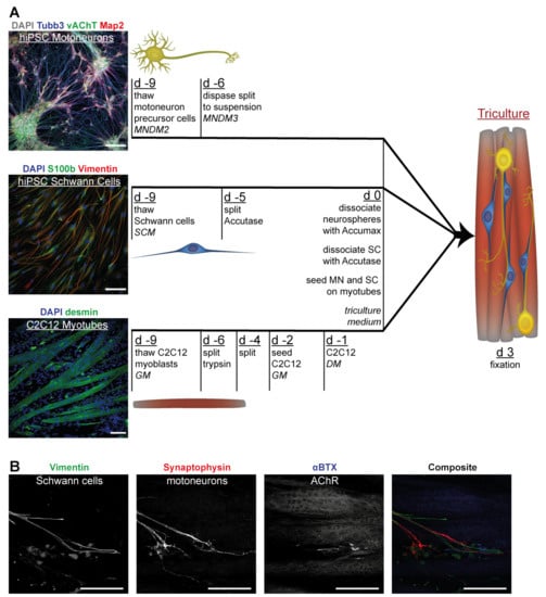 As mentioned, triM was based on the final MN differentiation medium, but Compound E was replaced with NRG1 to support SC. When used instead of standard C2C12 differentiation medium (DM), the serum-free triM formulation was able to induce differentiation of C2C12 into myotubes which showed spontaneous contractions. However, compared to DM, differentiation seemed to progress more rapidly in triM, and already after few days, extensive cell detachment and cell death was observed. This effect could be prevented if differentiation was induced initially by culturing C2C12 in DM and switching to triM subsequently. Therefore, in order to create tricultures C2C12 cells were seeded first and left for 24 h in differentiation medium. Then, hiPSC-derived SC and MN were added and the cultures switched to triM. This way, starting from cryopreserved C2C12 myoblasts, MN precursors, and SC, tricultures were obtained in nine days (Figure 5A). All three cell types were thawed on the same day in their respective media. C2C12 and SC were regularly passaged until tricultures were established. MN precursors were grown to a dense cell layer and subsequently cultured in suspension for six days. Two days prior to triculture seeding, C2C12 myoblasts were plated and differentiation to myotubes was induced 24 h later by switching to myoblast differentiation medium. Another 24 h later, the neurospheres obtained during the suspension phase were dissociated into a single-cell suspension and added to muscle cultures together with SC. Cultures usually developed within a few days to show contracting myotubes. Before massive contraction-induced detachment of the cultures from the glass surface, tricultures were fixed for evaluation three days after seeding of neurons and SC. Subsequently, staining for specific marker proteins was performed. These included Tubb3, synaptophysin, and vAChT for MN; S100b and vimentin for SC; and, finally, desmin or myosin heavy chain for myotubes. Additionally, nicotinic acetylcholine receptors (AChR), a marker for NMJs, were labelled with the snake venom α-bungarotoxin (αBTX) coupled to a fluorescent dye. Frequently, an alignment of SC with neurites was seen (79.9 ± 8.3% of SC in tricultures were completely or partially aligned with neurons; mean ± SD, n = 4) as well as colocalization of AChR with MN (70.0 ± 6.6% of all AChR clusters in tricultures colocalized with MN) or with both MN and SC (17.6 ± 10.1% of all AChR clusters; mean ± SD, n = 4). Representative confocal microscopy images of tricultures are shown in Figure 5B and Figure S4. To test whether the protocol could potentially be adapted to a completely hiPSC-derived triculture system, we also generated myotubes from hiPSC [37] and successfully cocultured them with hiPSC-derived MN and SC (Figure S5).