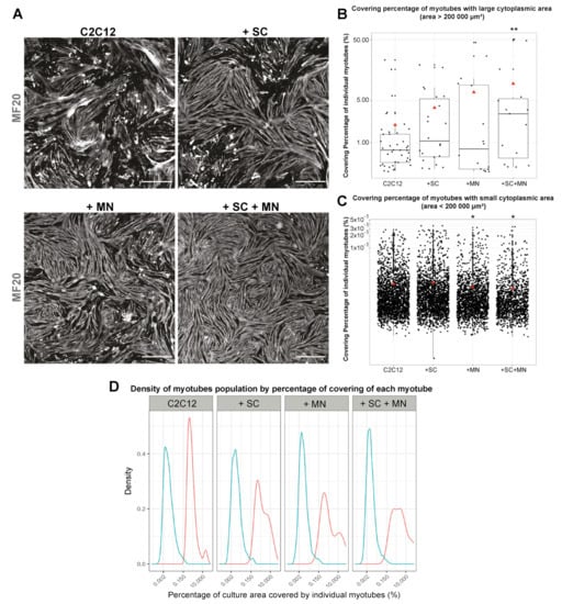 Cocultures promote formation of myotubes with increased cytoplasmic area. C2C12 cells were cultured on cover slips for three days in the absence (C2C12) or presence of either SC (+ SC), MN (+ MN), or both (+ SC + MN). Then, cells were fixed and immunostained for the muscle cell marker myosin heavy chain (MF20). (A) Representative microscopic overviews of MF20 fluorescence signals under culture conditions as indicated. Scale bars: 1000 µm. (B,C) Quantification of covering area of myotubes classified into two populations: large-type myotubes (>200,000 µm2) (B) and small-type myotubes (<200,000 µm2) (C). Red triangles on boxplots indicate mean values for given conditions; y-axes logarithmic. * p < 0.05, ** p < 0.01. (D) Density curves of analyzed myotubes expressed according to their respective percentages of covering area of the total cellular culture area. Blue and pink lines: density curves for myotubes with low and high cytoplasmic area, respectively; x-axes logarithmic.