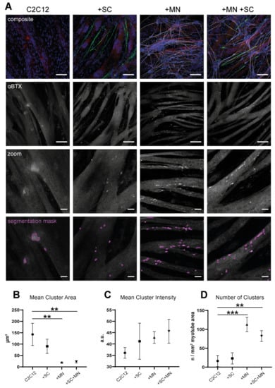 To investigate clustering of postsynaptic AChR on myotubes, AChR were stained with fluorescently labelled αBTX. Stained receptor clusters on myotubes were visualized by confocal fluorescence microscopy, segmented, and analyzed for their area, fluorescence intensity, and number. Results were compared for cultures of myotubes alone, C2C12 bicultures with MN or SC, and tricultures. Figure 7A shows stainings for specific markers of the individual cell types in the different cocultures as well as representative segmented AChR clusters. Quantitative analysis of AChR mean cluster sizes revealed a significant reduction from 142.7 ± 48.6 µm2 in C2C12 monocultures to 19.6 ± 1.7 µm2 and 22.4 ± 5.0 µm2 (mean ± SD) in C2C12 + MN and tricultures, respectively. In bicultures with SC, a trend towards decreased mean area (90.5 ± 31.3 µm2) was seen as well, but this was not statistically significant (Figure 7B). Regarding mean fluorescence intensity per cluster, an upward trend was found in cocultures when compared to myotubes alone, but the differences were not significant (Figure 7C). Finally, the number of segmented AChR clusters normalized to myotube area was analyzed. Compared to 16.2 ± 15 segmented clusters per mm2 myotube area in C2C12 monocultures, the number of receptor clusters increased significantly in cocultures of myotubes and MN (112.8 ± 9.0). In tricultures, the number of clusters was also increased but to a lesser extent than in bicultures with MN (82.0 ± 14.3 per mm2 in tricultures). In bicultures with Schwann cells, mean number per mm2 was 23.1 ± 14.9, showing no significant difference to C2C12 monoculture (Figure 7D). Additionally, myotubes were double-stained for the protein rapsyn, which is crucial for nerve-induced AChR clustering during muscle development (reviewed in [38]). In C2C12 monocultures, only 36.3 ± 3.1% of segmented AChR clusters stained positive for rapsyn (Figure S6). This value increased significantly in biculture with MN (58.0 ± 5.5%) and in tricultures (60.2 ± 1.9%). In bicultures with SC, 48.6 ± 12.6% of segmented clusters were positive for rapsyn, showing a non-significant increasing trend (Figure S6). Taken together, these results confirm the inducing effect of hiPSC-derived MN on AChR cluster formation and suggest an additional influence of SC coculture.