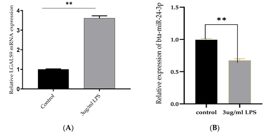 3.1. Reduced Expression of Bta-miR-24-3p and Elevation of LGALS9 following LPS-Stimulation In Vitro