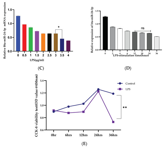 Figure 1. Expression of Bta-miR-24-3p and Galectin 9 gene(LGALS9) in BEECs stimulation with LPS. (A) BEECs were triggered with 3 μg/mL LPS concentrations for 24 h, and RT-qPCR measured the expression of LGALS9. (B) The BEECs were stimulated with 3 µg/mL LPS for periods of 24 h, and RT-qPCR measured the Bta-miR-24-3p expression level. The relative expression of Bta-miR-24-3p was normalized to U6 snRNA. (C) Different concentrations of LPS were used to induce BEECs for 24 h, revealing the different levels of Bta-miR-24-3p expression. (D) The BEECs were stimulated with 3 µg/mL LPS for additional periods, and RT-qPCR measured the Bta-miR-24-3p expression level. The relative expression of Bta-miR-24-3p was normalized to U6 snRNA. (E) The cell viability was investigated within different periods after treatment with 3 μg/mL LPS using the CCK-8 kit. The results are presented as the average of three experimental observations with mean ± SEM. * p < 0.05; ** p < 0.01. (Student t-test or One-way ANOVA).