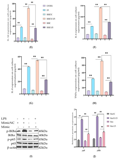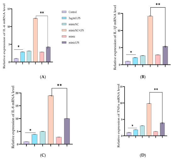 Figure 4. Inhibition of Bta-miR-24-3p elevated LPS-induced inflammatory response. (AD) BEECs were transfected with 50 nM Bta-miR-24-3p inhibitors or 100 nM Bta-miR-24-3p inhibitors NC for 7 h and then stimulated with 3 µg/mL LPS for 24 h. The mRNA expression of cytokines (IL-1β, IL-6, IL-8, and TNF-α) was analysed using the RT-qPCR technique. β-actin was used as an endogenous control. (EH) The ELISA technique assayed the pro-inflammatory cytokine concentration of IL-1β, IL-6, IL-8, and TNF-α in the cell supernatant. The results are presented as the average of three experimental observations with mean ± SEM. * p < 0.05; ** p < 0.01. (Student t-test).