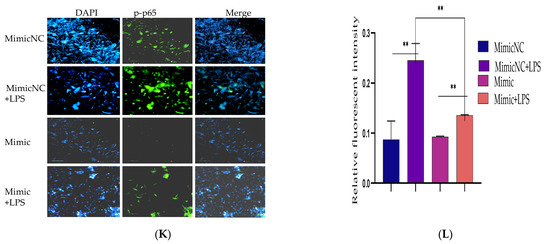 Figure 2. Overexpression of Bta-miR-24-3p attenuated LPS-induced inflammatory response. (AD) Cells were transfected with 50 nM Bta-miR-24-3pmimics or 100 nM Bta-miR-24-3p NC for 7 h, and then stimulated with 3 µg/mL LPS for 24 h. The expression of cytokines IL-1β, IL-6, IL-8, and TNF-α was determined by RT-qPCR. β-actin was used as an endogenous control. (E,H) The cell supernatant from the transfection experiment was harvested to evaluate the cytokine concentration using the ELISA method. (I) BEECs was transfected with 50 nM Bta-miR-24-3p mimics or 100 nM Bta-miR-24-3p NC for 7 h and then stimulated with 3 µg/mL LPS for 36 h. The protein levels of NF-κB p65 and IκBα were measured by Western blotting. β-actin as an internal control. (J) The differential values of the indicated proteins were measured by IPP 6.0 software. (K) Immunofluorescence staining revealed the p65 subunit translocation from the cytoplasm into the nucleus (×200) using scale bar = 100 µm. cell nuclei were stained as blue spots, and green spots indicate p-p65 staining. (L) The relative fluorescence intensity of p-p65. The data were presented with triplicate experimental observations as mean ± SEM. * p < 0.05; ** p < 0.01. (Student t-test).