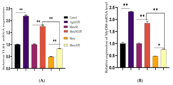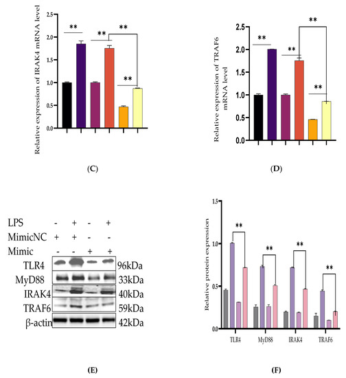 Figure 3. Downregulation of TLR4 and its effect modulator by Bta-miR-24-3p. BEECs were transfected with 50 nM of Bta-miR-24-3p mimics or 100 nM of Bta-miR-24-3p NC for 7 h and then stimulated with 3 µg/mL LPS for 24 h (AD). The mRNA expression of TLR4, MyD88, IRAK4, and TRAF6 was determined by RT-qPCR. β-actin was used as an endogenous control. (E) Cells were treated as (AD), and the protein levels of upstream molecules of the TLR4 pathway were measured by western blotting. (F) Gray values of the indicated proteins were measured by Image-Pro Plus (IPP) 6.0 software. The results are presented as the average of three experimental observations with mean ± SEM. * p < 0.05; ** p < 0.01. (Student t-test).
