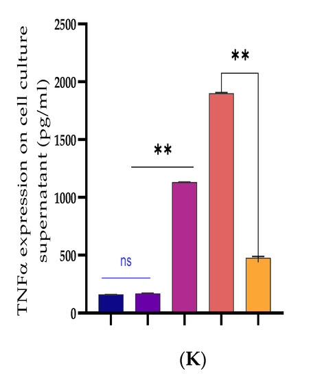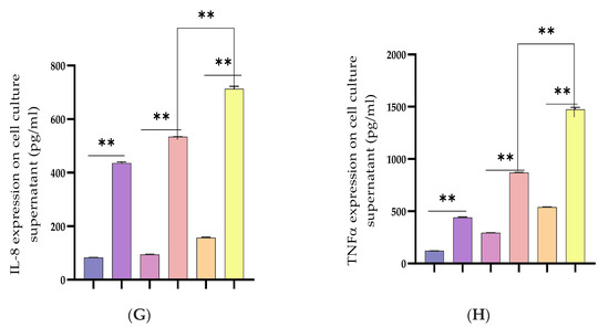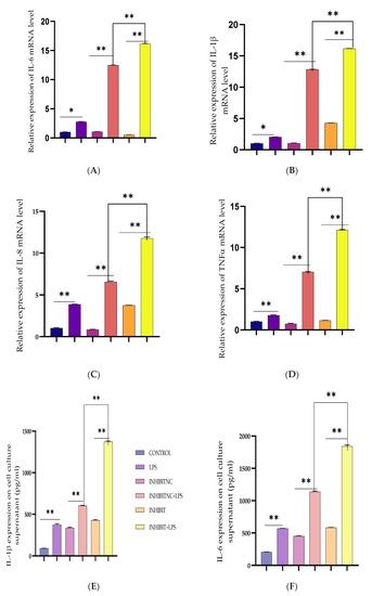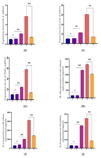 After the designated treatment, the secretion levels of tumor necrosis factor-α (TNF-α), interleukin-1β (IL-1β), IL-8, and IL-6 in cell supernatants were measured using particular commercial enzyme-linked immunosorbent assay (ELISA) kits (Solarbio, Beijing, China) following the manufacturer’s instructions. ELISA results were detected using a microplate reader (BioTek’s Epoch™, Winooski, VT, USA) and analysed according to the standard curve.