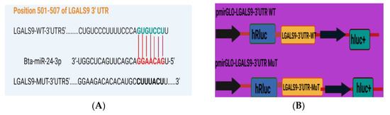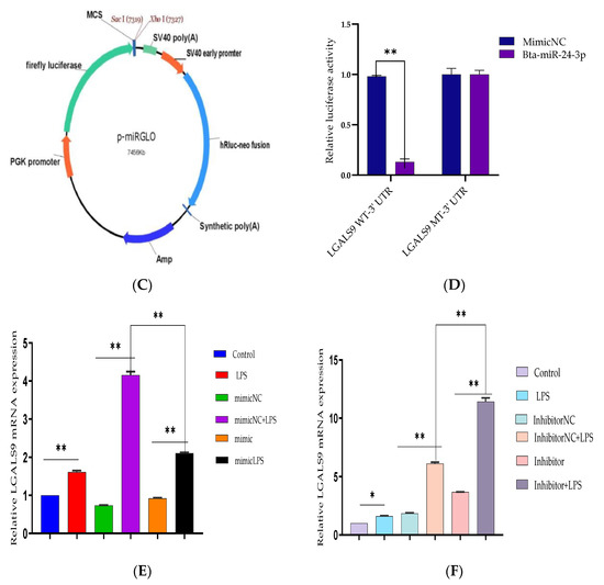 Figure 5. Evaluation of LGALS9 as a peculiar gene interacting with Bta-miR-24-3p. (A) The bioinformatics prediction of interaction between LGALS9-3′UTR and Bta-miR-24-3p was revealed by TargetScan and miRanda. (B) Recombinant cloning sketch of pmirGLO mutant-type LGALS9 3′-UTR or pmirGLO wild-type LGALS9 3′-UTRinto HEK293T cells. (C) Schematic construction of pmirGLO mutant-type LGALS9 3′-UTR and pmirGLO wild-type LGALS9 3′-UTR. (D) The dual-luciferase reporter assay was performed using HEK293T cells. Cells were co-transfected with the wild- or mutant-type LGALS9 3′-UTR luciferase reporter vectors, as well as Bta-miR-24-3p, mimics or mimics NC. The luciferase activity was represented by the ratio of Renilla activity/Firefly activity using the Luminometry method. (E) BEECs were transfected with 50 nM Bta-miR-24-3p mimics or 100 nM Bta-miR-24-3p mimics NC for 7 h and then stimulated with 3 µg/mL LPS for 24 h. The mRNA expression of LGALS9 was measured using the RT-qPCR technique. (F) BEECs were transfected with 50 nM Bta-miR-24-3p inhibitors or 100 nM Bta-miR-24-3p inhibitors NC for 7 h and then stimulated with 3 µg/mL LPS for 24 h. The mRNA expression of LGALS9 was measured using the RT-qPCR technique. β-actin was used as an endogenous control. The results are presented as the average of three experimental observations with mean ± SEM. * p < 0.05; ** p < 0.01. (Student t-test).