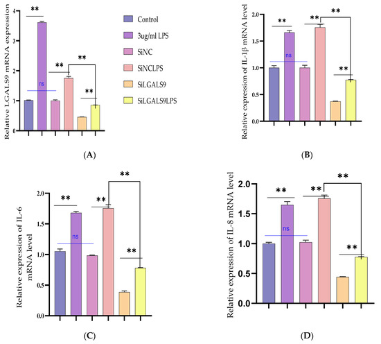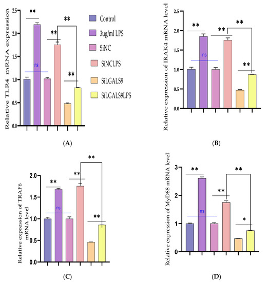 Figure 7. Silencing the expression of LGALS9 negatively modulates TLR4 and its effector molecules. The Si-LGALS9 and Si-NC have been transfected for 7 h of transfection and induction of BEECs with LPS (3 μg/mL) for another 24 h. (AD) The mRNA expression levels of TLR4 and its molecular mediators (IRAK4, TRAF6, and MyD88) were analysed with the RT-qPCR technique. Data are represented by the mean ± SEM of triplicate independent experiments, * p < 0.05; ** p < 0.01. (Student t-test).