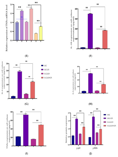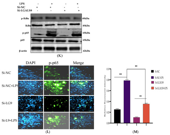 Figure 6. The cellular silencing of the LGALS9 gene in BEECs attenuates activation of pro-inflammatory cytokines and gene expression. The Si-LGALS9 and Si-NC were transfected for 7 h transfection and induction of BEECs with LPS (3 μg/mL) for another 24 h. (A) After the transfection of Si-LGALS9 and Si-NC, knockdown of LGALS9 (Si-LGALS9) results in LGALS9 downward expression using the RT-qPCR method. (BE) The expression levels of pro-inflammatory mediators (IL-1β, IL-6, IL-8, and TNF-α) were analysed with the RT-qPCR technique. (FI) The ELISA technique assayed the pro-inflammatory cytokine concentration of IL-1β, IL-6, IL-8, and TNF-α in the cell supernatant. (JK) The protein phosphorylation levels of p65 and IκBα were measured by Western blot. β-actin was used as an internal control. (LM) The fluorescence intensity of p-p65 protein expression using Immunofluorescence assay revealed reduced protein expression due to LGALS9 silencing. The scale bar is 100 μm. Data are represented by the mean ± SEM of triplicate independent experiments, ** p < 0.01. (Student t-test).