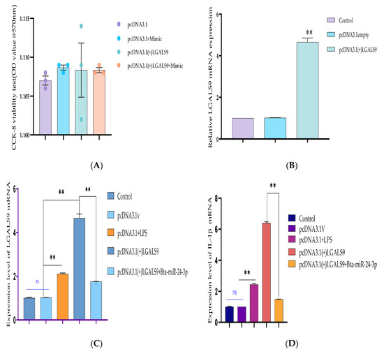 Figure 8. Recombinant DNA cloning vector construction and transfection into BEECs. (A) The evaluation of cell viability on pcDNA3.1empty vector, pcDNA3.1empty vector and Bta-miR-24-3p mimic, pcDNA3.1(+)TLR4, and pcDNA3.1(+)TLR4 and Bta-miR-24-3p mimic transfected into BEECs for 24 h was done using the CCK-8 assay kit. (B) The RT-qPCR was used to verify the transfection efficiency of pcDNA3.1empty vector and pcDNA3.1(+)TLR4 in BEECs (C). The expression level of LGALS9 was attenuated in co-transfection of pcDNA3.1(+)TLR4 and Bta-miR-24-3p mimics using the RT-qPCR technique. (DG) Cells were transfected with pcDNA3.1empty vector, pcDNA3.1empty vector and Bta-miR-24-3p mimic, pcDNA3.1(+)TLR4, and pcDNA3.1(+)TLR4 and Bta-miR-24-3p for 24 h. The expression of cytokines IL-1β, IL-6, IL-8, and TNF-α was determined by RT-qPCR. β-actin was used as an endogenous control. (HK) After the co-transfection experiment, the cell supernatants were collected to analyse the cytokine concentrations (IL-1β, IL-6, IL-8, and TNF-α) using the ELISA techniques. The results are presented as the average of three experimental observations with mean ± SEM. ** p < 0.01. (Student t-test).